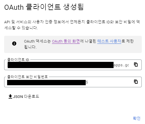 이렇게 생성하게 되면, 클라이언트ID와 비밀번호를 생성해 주는데요.