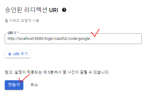 웹 애플리케이션을 선택하고, 이름에는 프로젝트 이름을 적어 줌니다. 아래로 내려와서, 승인된 리디렉션 URI에 다음과 같이 적어 줌니다.