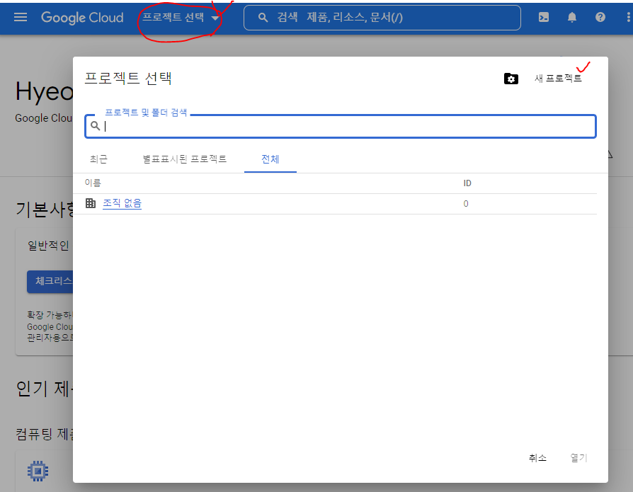https://console.cloud.google.com/ 여기에서, 프로젝트 선택.
