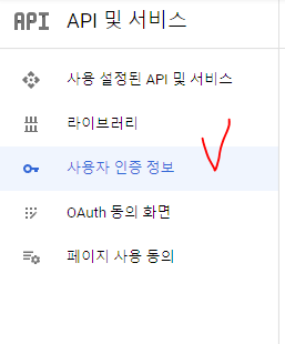 적당한 이름으로 프로젝트 이름을 적은 뒤, 만들어 줌니다. 그런 후에, API 및 서비스 메뉴를 클릭해서 이동 해줌니다.